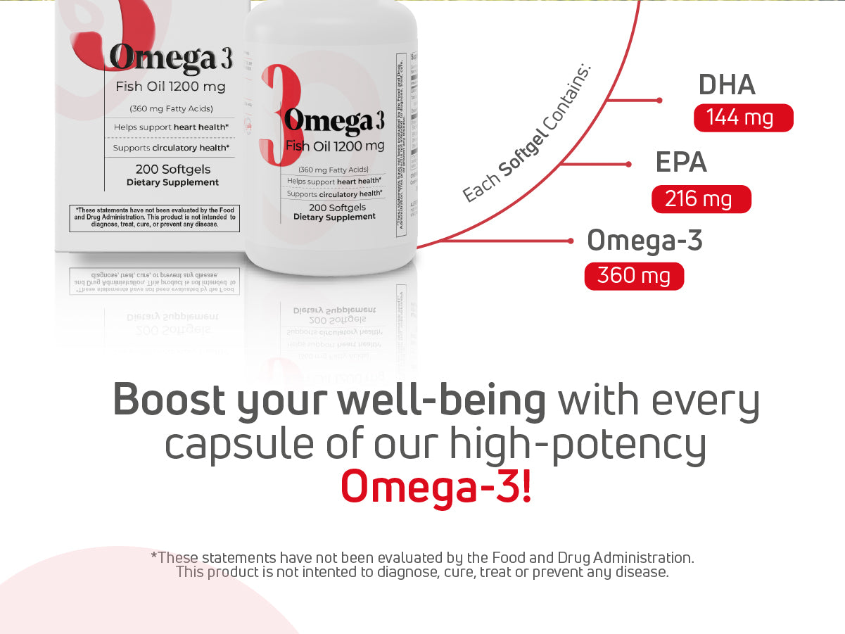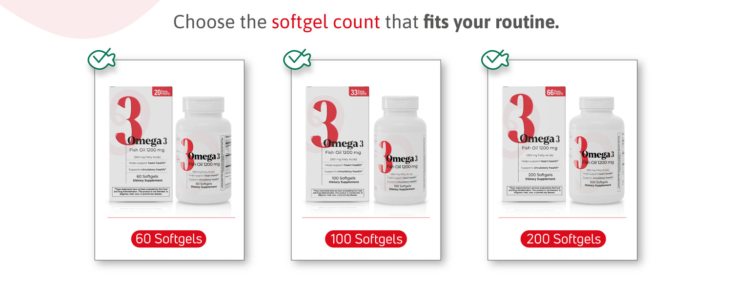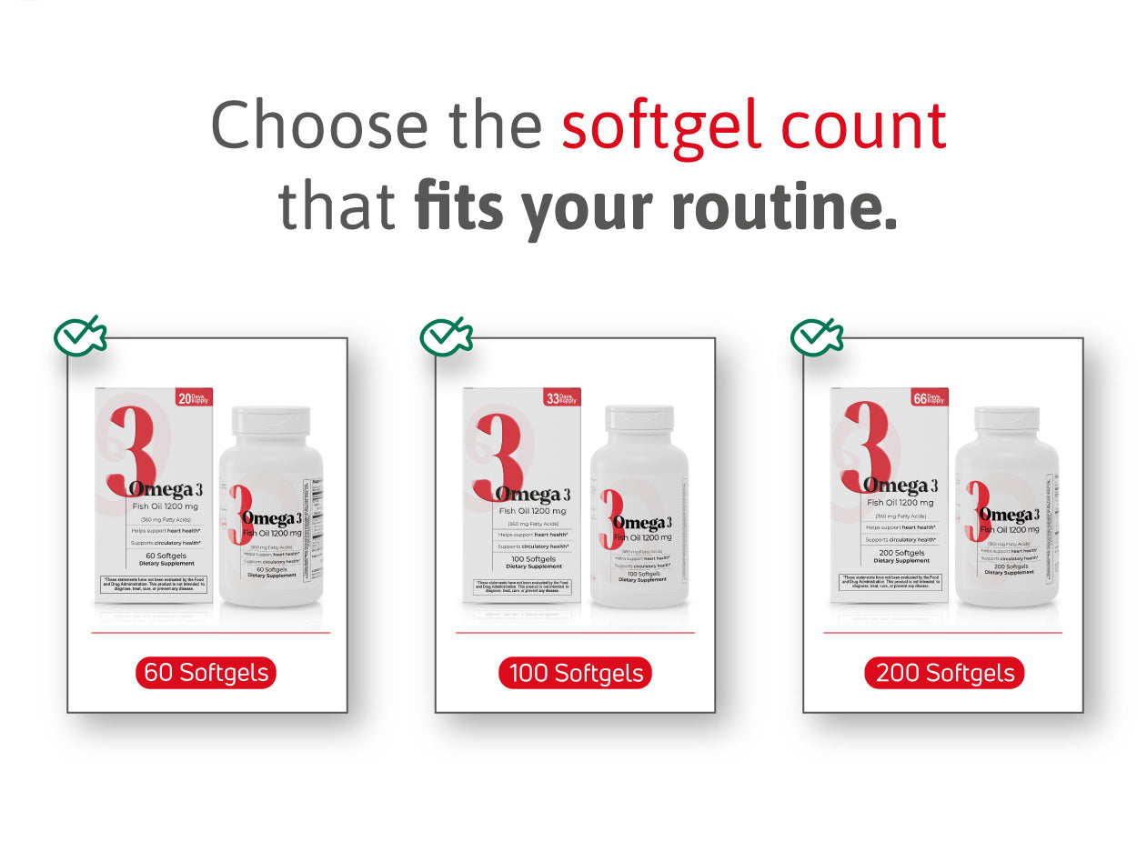 Omega 3 Fish Oil with 1200 mg per softgel. Supports heart, brain, and immune health. Available in 60, 100, or 200 softgels.